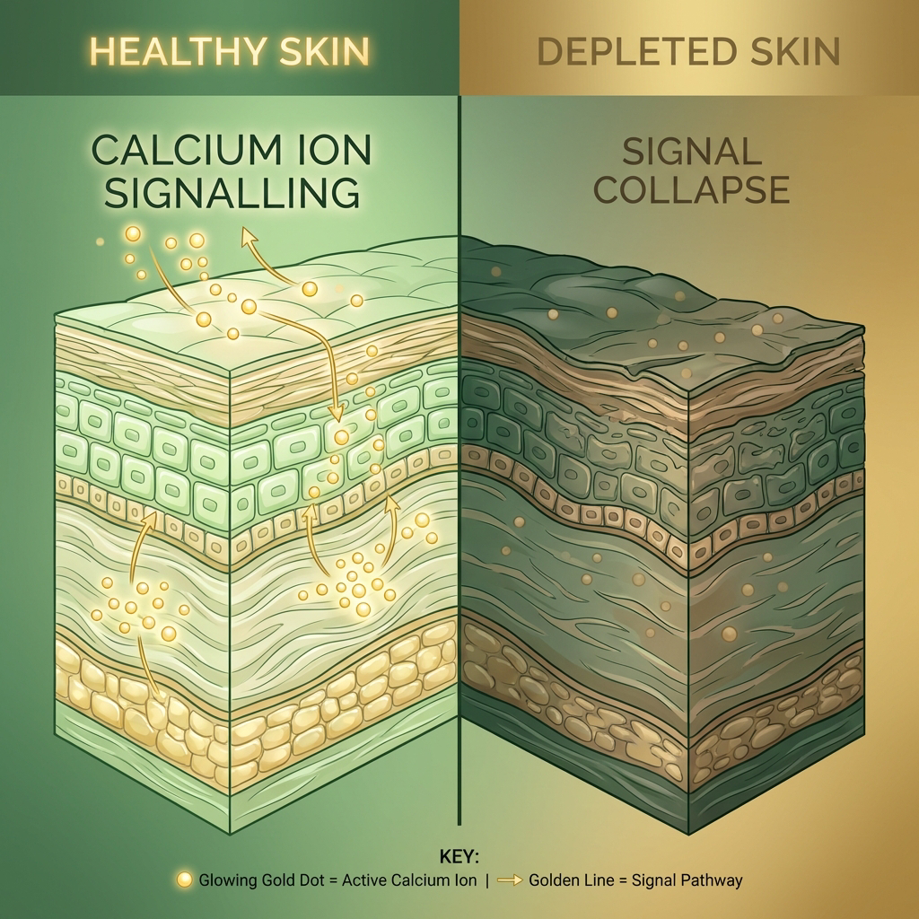When oestrogen declines, calcium ion signalling breaks down. Your skin stops receiving the instruction to renew. Instead of rebuilding, it depletes its own structure — collagen scaffolding, under-eye volume, the firmness around your mouth.