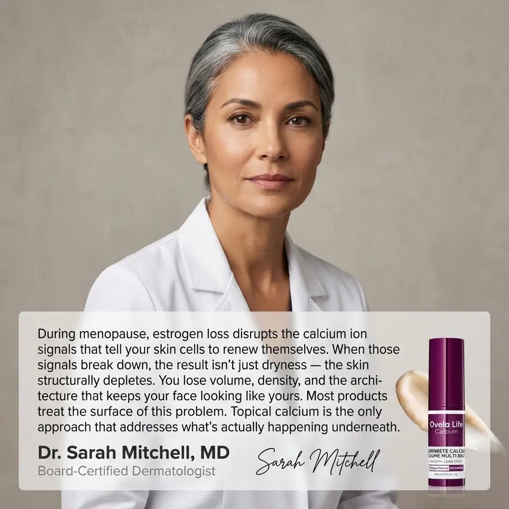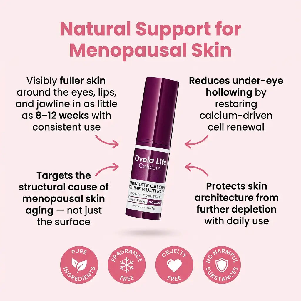 During menopause, falling estrogen disrupts calcium ion signalling in your skin — the process that tells your skin cells to renew and rebuild. We call this Calcium Cannibalism: the point where skin stops receiving the renewal signal and starts quietly depleting its own structural reserves. Volume depletes. Scaffolding collapses. The hollow under your eyes deepens. The Ovela Calcium Balm Stick delivers calcium ions directly to your skin via a solid lipid base, restoring the signalling process where the breakdown is actually happening — underneath the surface.